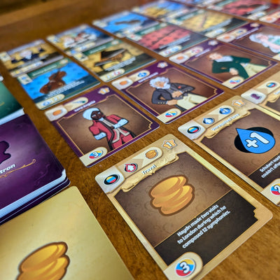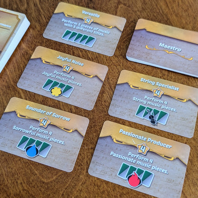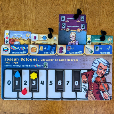 With each turn, players choose one of four actions: Seek Inspiration, Seek Fortune, Seek Patronage, or Perform. Inspiration is your primary resource and it comes in three tones - Joy, Passion, and Sorrow. Seeking inspiration allows you to gain your resources while all of the other actions will have players spend inspiration to acquire cards. Fortune cards help build your engine, which can allow you to gain bonus actions on your turn. Patron cards can also help build your engine or can give you bonus legacy points for end-game scoring. Chamber Music and Concert Music cards give you lots of legacy points, but every time you perform, your opponents can attend your performance and gain inspiration. You will not only have a special ability as your specific composer, but you are also the only person who can compose your very own Magnum Opus. Complete specific goals to gain Maestro cards and end the game.