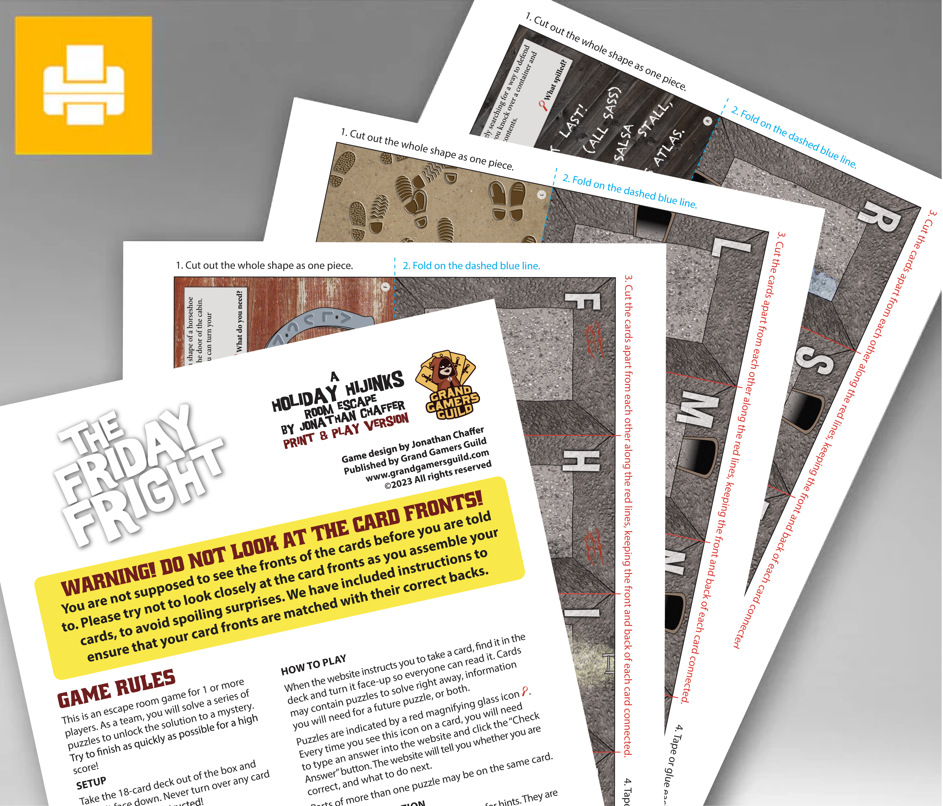 Deluxe print and play files for Grand Gamers Guild's titles come in high-resolution and include helpful instructions for home assembly. These instant-access files are a great way to experience our games at a reduced cost and without the need to pay or wait for shipping.