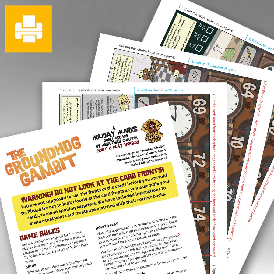 The Groundhog Gambit, title #6 in the Holiday Hijinks line, is an 18-card escape room experience for 1 or more players, and takes two sessions of about 60 minutes to solve cooperatively.