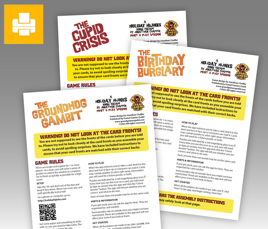 Get three of our most popular Hijinks games for a special discounted price! As always, each game presents a mysterious circumstance that requires wit and clever detective skills to solve. But no worries, if you get stuck we always have a built in hint system! It's the perfect game for your game night!