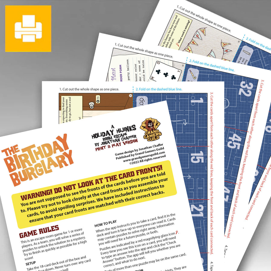The Birthday Burglary, title #5 in the Holiday Hijinks line, is an 18-card escape room experience for 1 or more players, takes about 60 minutes to solve cooperatively, and introduces a new interactive objects mechanism to gameplay!