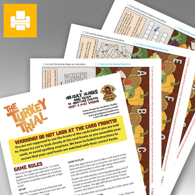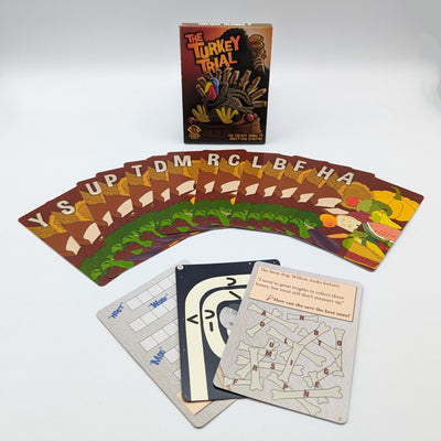 The Turkey Trial, title #7 in the Holiday Hijinks line, is an escape room style game in just 18 cards! As a group, you will solve a series of puzzles to unravel a mystery.