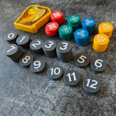 This is for the gamers who bought Tir na nOg at their FLGS and want to upgade their bits. Includes an wooden full color start player marker and wooden replacements for your punchboard color and number change tokens.