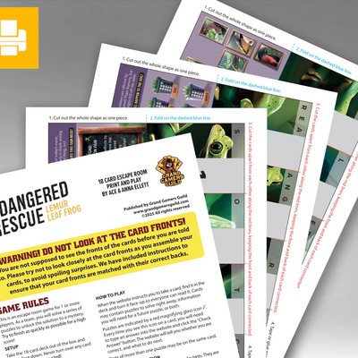 Endangered Rescue: Lemur Leaf Frog is part of the 18Escape line of games, each of which packs a full escape room game experience into a tiny package! As a group, you will solve a series of puzzles to unravel a mystery.