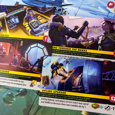 The Artemis Project: Satellites & Commanders is an expansion that adds two new major opportunities for strategic play to the base game. Satellites are off-board locations that players can access and influence the action on the moon’s surface below in subtle yet powerful ways. Commanders are a new category of colonists that can act as any colonist type, lend their power to dice you send to various locations, and assist in end-game scoring. Photos are of Deluxe Edition