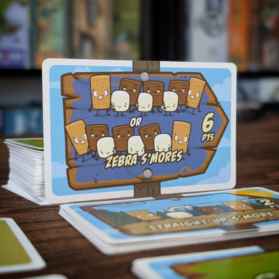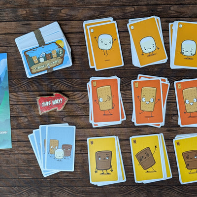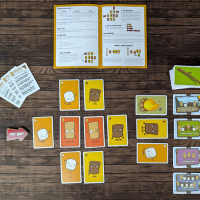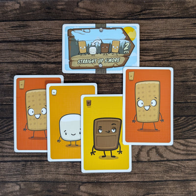 In S’mores Galore, players compete to score the most points. You score points by making S'mores. To make S'mores, you'll first have to grab graham crackers, chocolate, and marshmallow cards from a grid on the table. You'll have to stack them in your line-up in the order you pick them up to create the perfect S’mores. With some clever hand management, you can score a lot of S'mores and win the game.