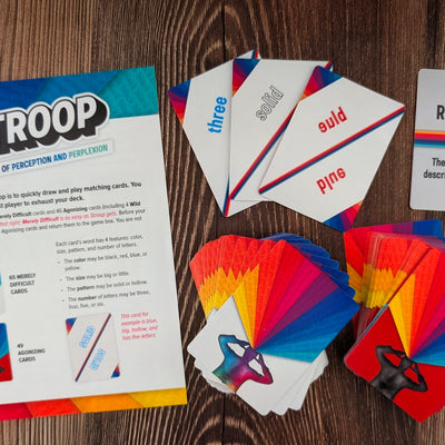 The cards in Stroop each display a single word. The words are printed in several colors (black, red, blue, and yellow), sizes (big and little), styles (hollow and solid) and have different numbers of letters (three, four, five, and six). The challenge is to read one word and quickly match it with the description of another word—without regard to what the second word says. Race to empty your deck before your opponents!
