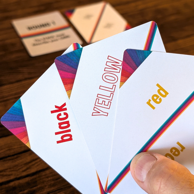 The cards in Stroop each display a single word. The words are printed in several colors (black, red, blue, and yellow), sizes (big and little), styles (hollow and solid) and have different numbers of letters (three, four, five, and six). The challenge is to read one word and quickly match it with the description of another word—without regard to what the second word says.